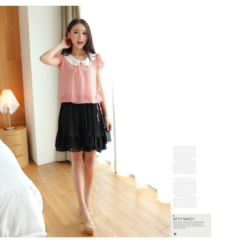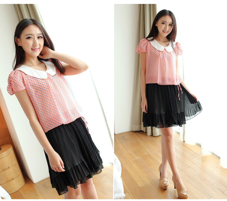 一件代发韩版雪纺连衣裙 韩版假两件收腰时尚黑白 短袖连衣裙B79