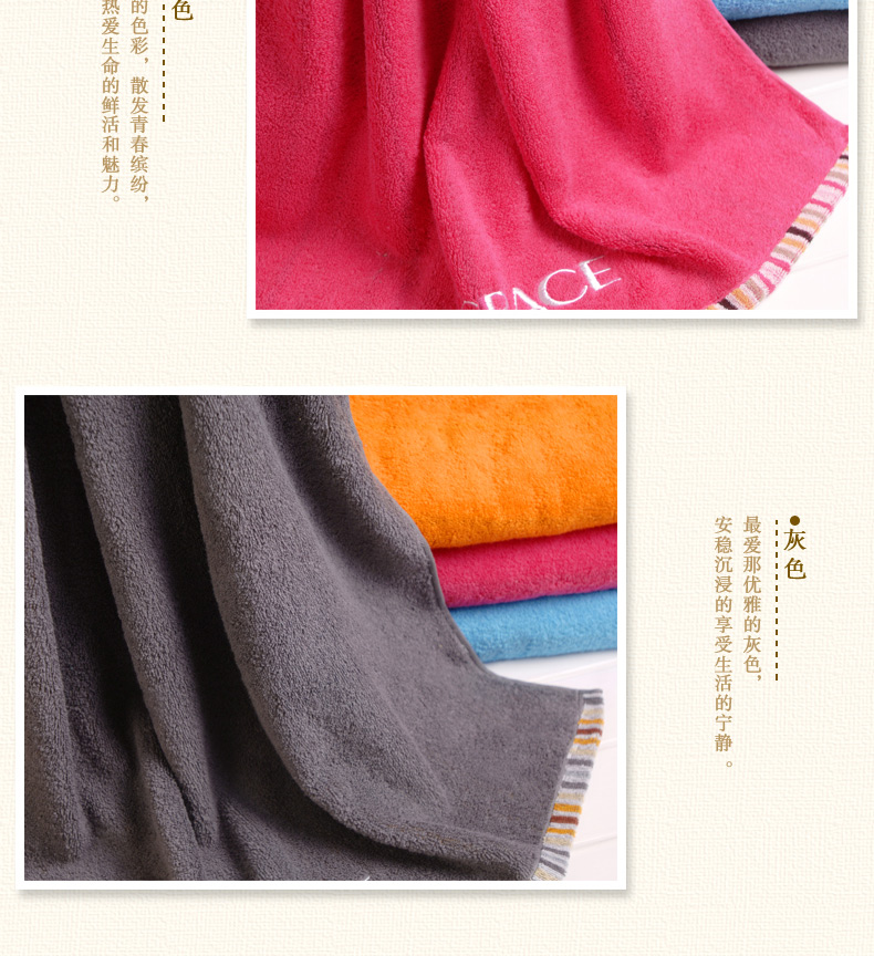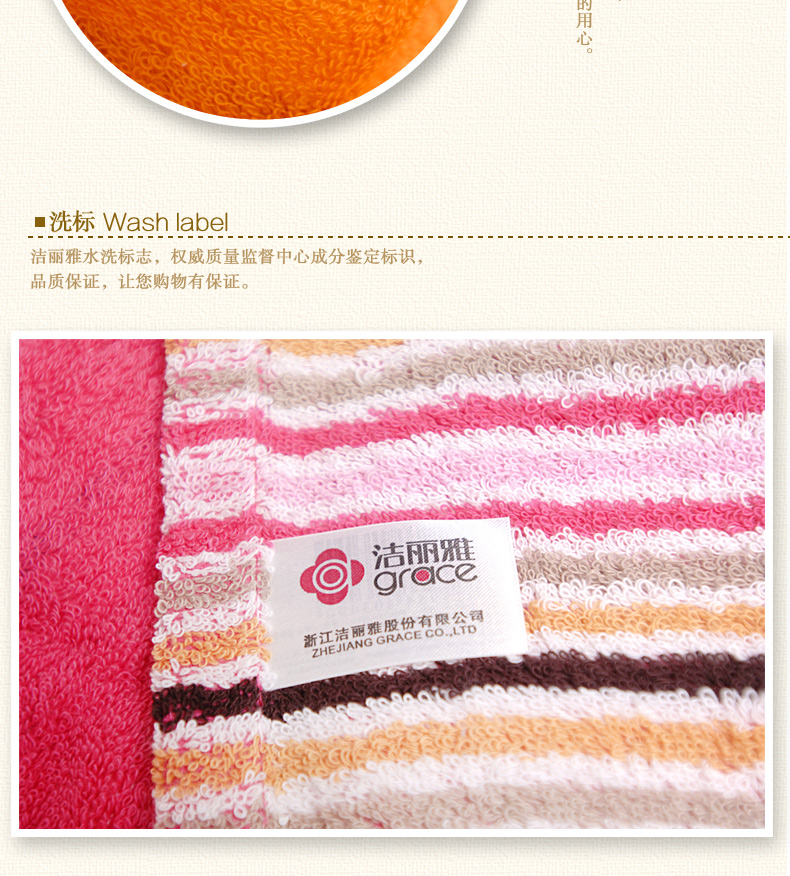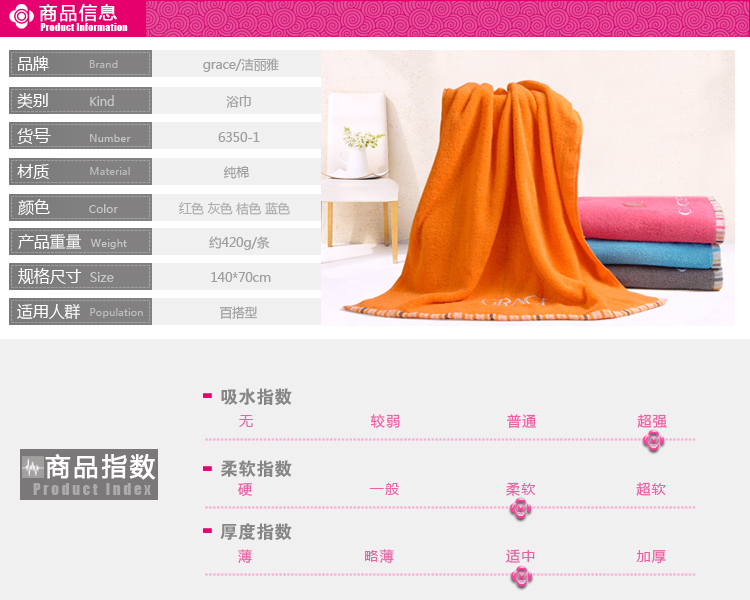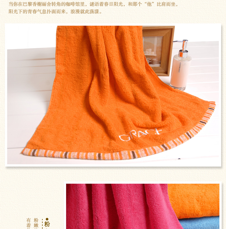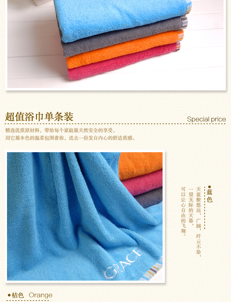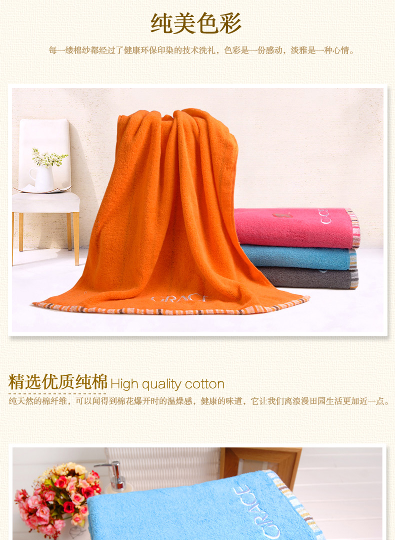 洁丽雅纯棉多色款6350-1款浴巾四色可选,超大加厚款,洁丽雅经典英文LOGO刺绣款"GRACE".