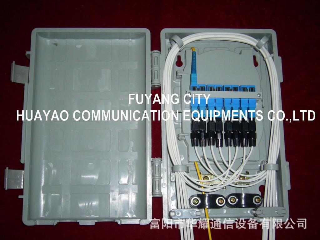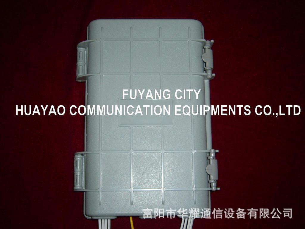 GP-HY-C型2-8芯(带适配器)光缆(用户)终端盒,是本公司精心开发、研制和创新的实用新型专利产品。结构设计是左右开启式,打开方便(适用了目前易操作卡扣式开启)光缆和尾纤单面进出,安装方便可靠。终端盒外壳材料采用高强度工程塑料,有较好的机械强度,外形美观大方,坚固耐用。光纤熔纤盘是左右翻转式设计,打开角度达180度,便于光纤的安装和维护。尾纤固定采用进口弹性体材料,用压卡式的方法进行安装极为方便。当尾纤配线不确定使用时(暂不使用)可将尾纤盘入盒内走线环,等到需要使用时再将尾纤活动连接头装出盒外,这样不需要通过适配器(法兰盘)连接就能直接与终端设备联接,如果客户有需要同时盒内也可以安装2-8颗适配器(法兰盘)更利于施工。