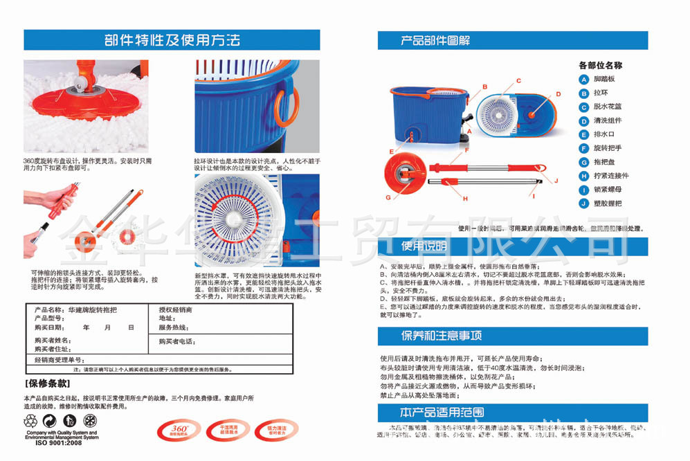 功能及特色说明 | 1、新型脱水装置,可自行控制布条干湿度,兼具清洁、吸尘、吸水效果。省时方便快速干燥更安全。 2、新型拖把头专利设计,可以360度任意旋转,均匀清洁,轻松深入任何角落,不留死角。 3、布条纤维独特清洁面设计、耐磨纤维材质,强力清洁、耐磨抗菌,不会刮伤各式地板或其他清洁面的精致表面,可防止异味或霉菌滋生。 4、新型强力脱水槽,不插电脱水机采用离心力原理快速脱水,即环保又省能。也能当成小型脱水机,适用一般布料、毛巾、袜子等小型物品。 |