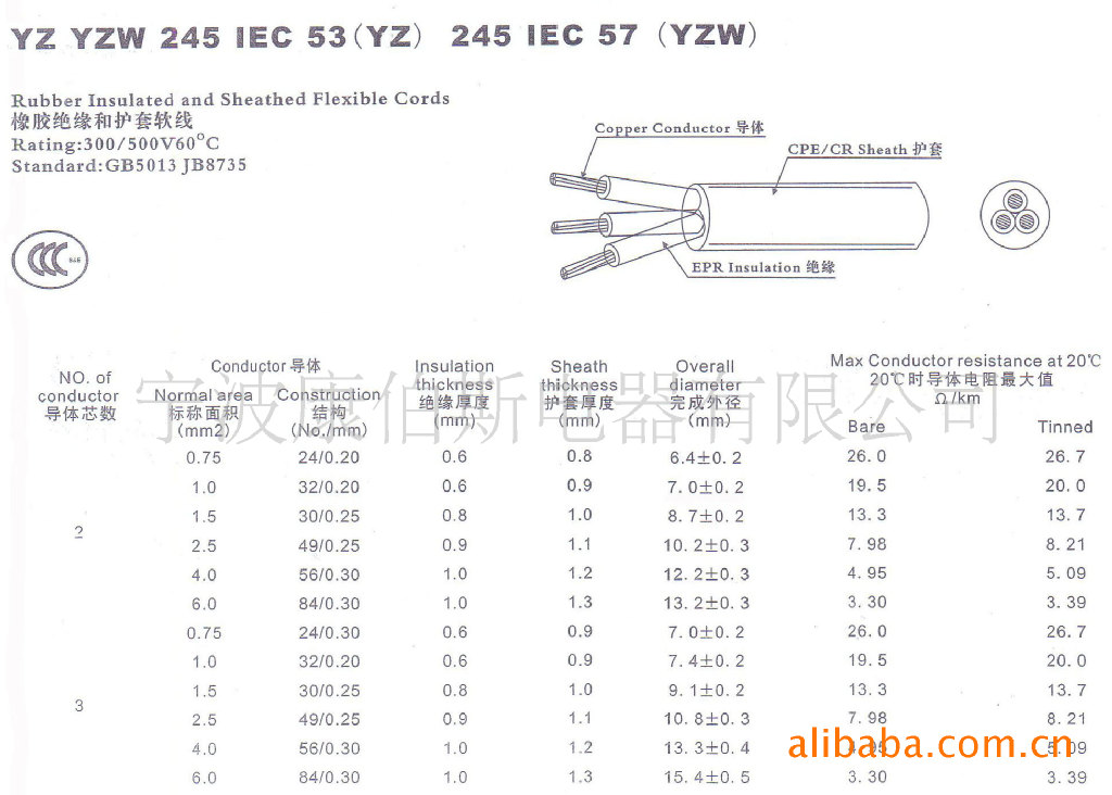 CCC国标认证IEC 53 YZ 橡胶线规格如下: