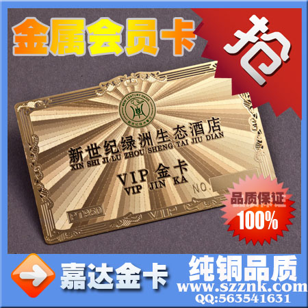 此种金属卡系选用高级进口铜材,采用领先新工艺技术,经过设计、线割制模、冲压、腐蚀、印刷、抛光、电镀、填色、包装再加条码技术等多道传统工艺及现代化先进技术精制而成。