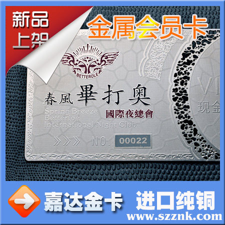 此种金属卡系选用高级进口铜材,采用领先新工艺技术,经过设计、线割制模、冲压、腐蚀、印刷、抛光、电镀、填色、包装再加条码技术等多道传统工艺及现代化先进技术精制而成。
