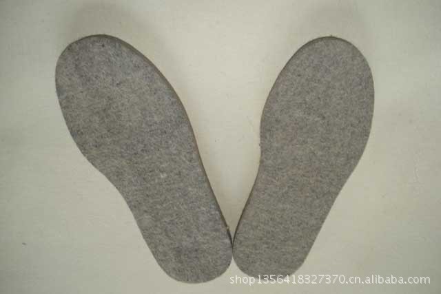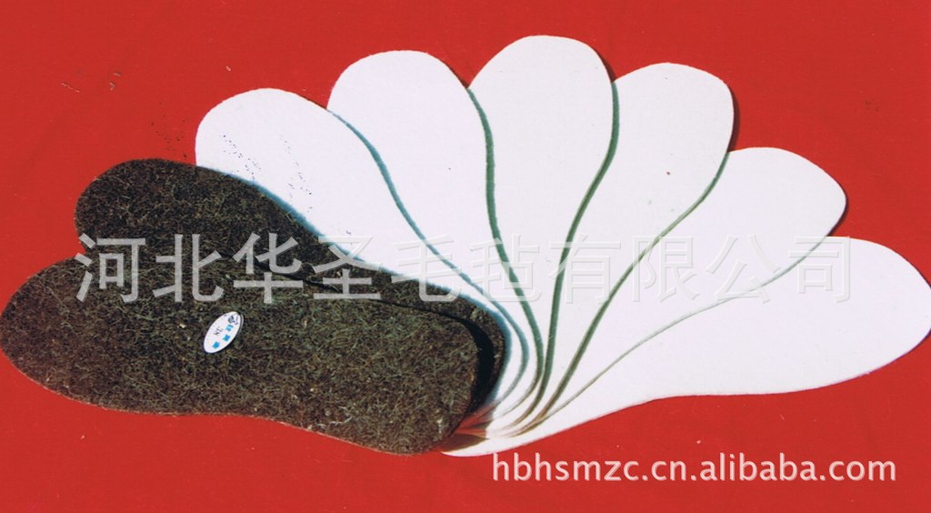 毛毡鞋垫俗称羊毛毡鞋垫,毛毡鞋垫是采用羊毛毡冲切而成,毛毡鞋垫具还具有耐磨和良好的保暖性能。毛毡采用天然羊毛成,利用羊毛的缩绒特性经机加工粘合而成(非经纬交织)。主要特征如下:富有弹性,可作为防震、密封、衬垫和弹性钢丝针布底毡的材料。粘合性能好,不易松散,可冲切制成各种形状的零件。保温性能较好,可作为隔热保温材料。组织紧密,孔隙小,可作为良好的过滤材料。耐磨性较好,可作为抛磨光的材料。富有弹性,所以经缩绒原理粘合而成。缩绒粘合后由密度的大小,规格的不同可分开使用。由于毛毡的密度紧凑性能较稳定可冲压生产各种毛毡零件。毛毡的伸缩行性比较好,可达到规定的长度可用语皮革滚动带、造纸吸浆带。毛毡的保暖性好,可制成个规格的毛毡鞋垫。