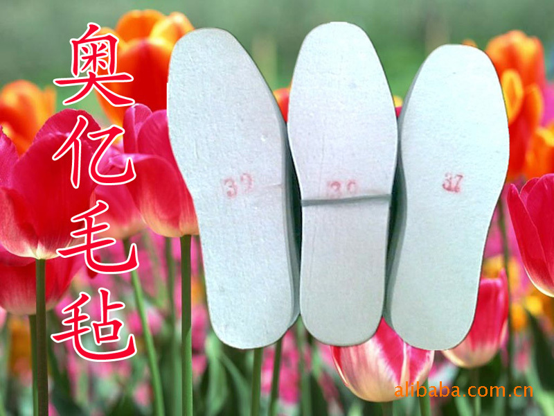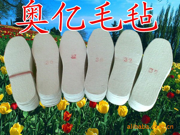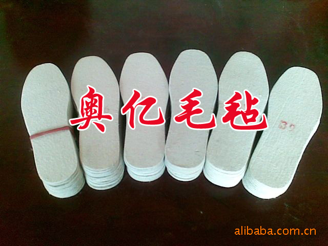 南宫市奥亿毛毡有限公司;生产的鞋垫有三种;种毛毡鞋垫.;厚度为3.5-4毫米鞋垫,号码有36-45【46】码,本款鞋垫每捆10双,每包1200双。
