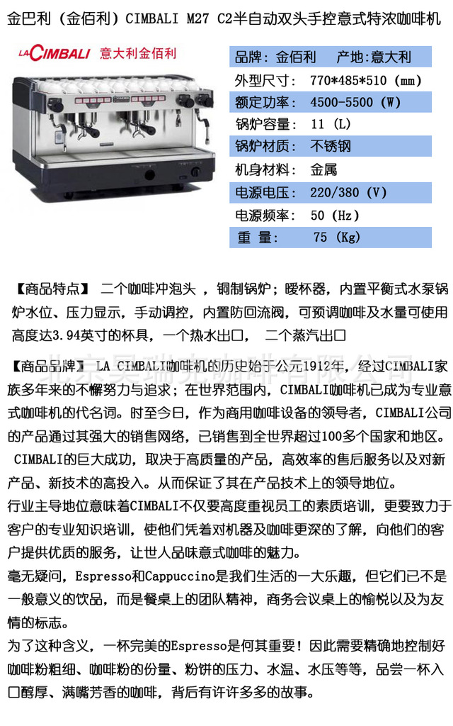 金巴利(金佰利)CIMBALI M27 C2 半自动双头手控意式特浓咖啡机