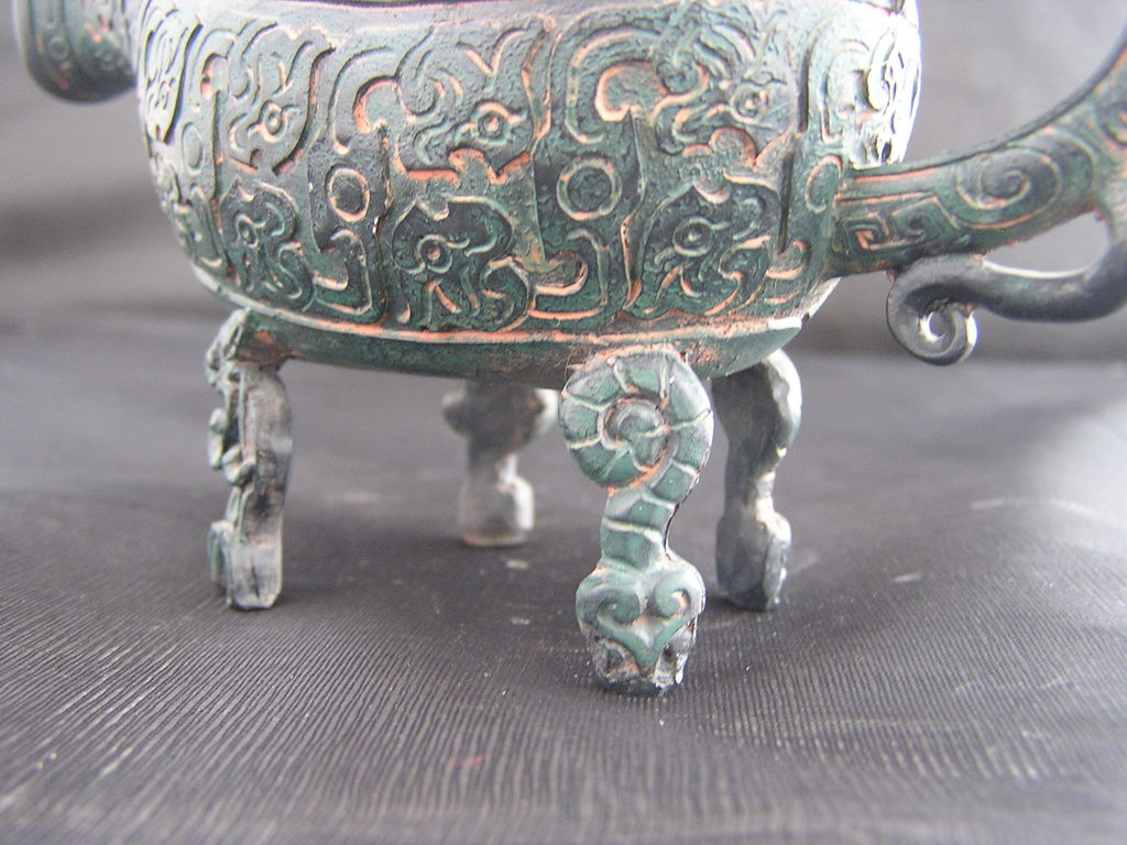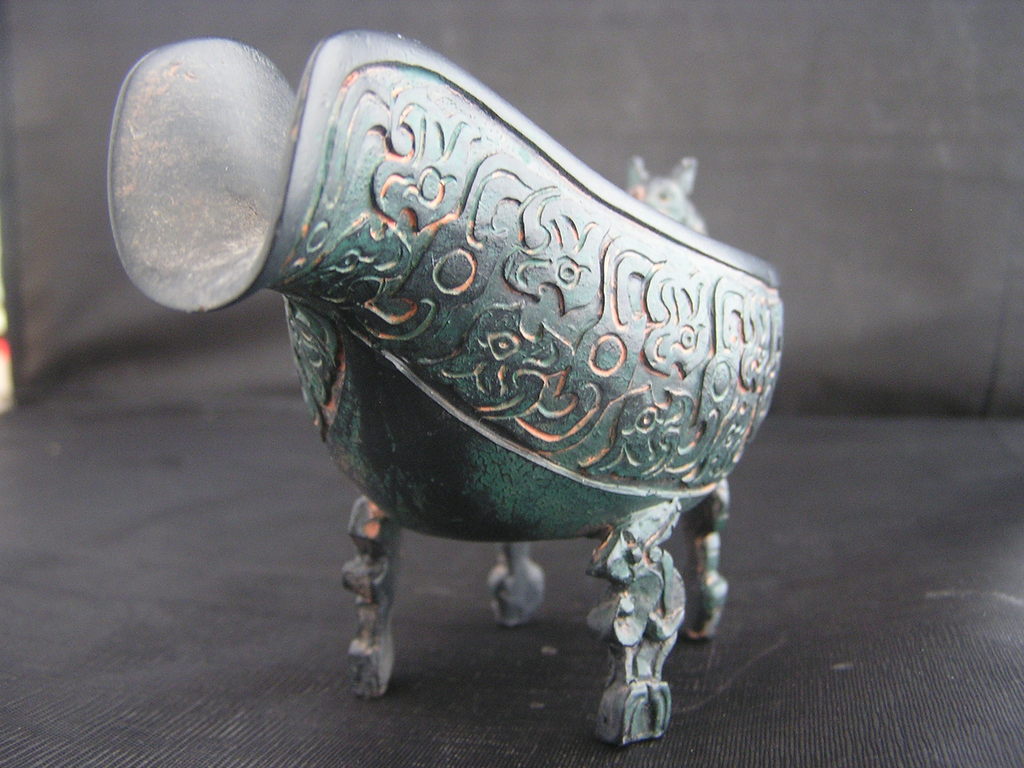 - 产品描述:此产品外形可归类为工艺品,为仿古代青铜器皿-酒杯。凹凸的纹路,黑色为主题,红铜色与暗绿色轻轻扫摸在酒杯表情,打造出无以比拟的仿古气息。置放在酒店,餐厅,增添古色古香。
