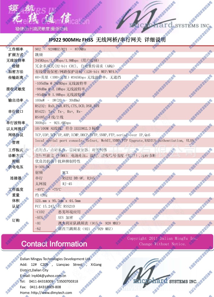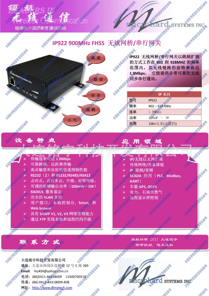 IP922无线网桥/串行网关以跳频扩频的方式工作在902到928MHZ的频率范围内,其无线链路的波特率高达1.9Mbps, 它能提供非常可靠的无线同步串行通讯。