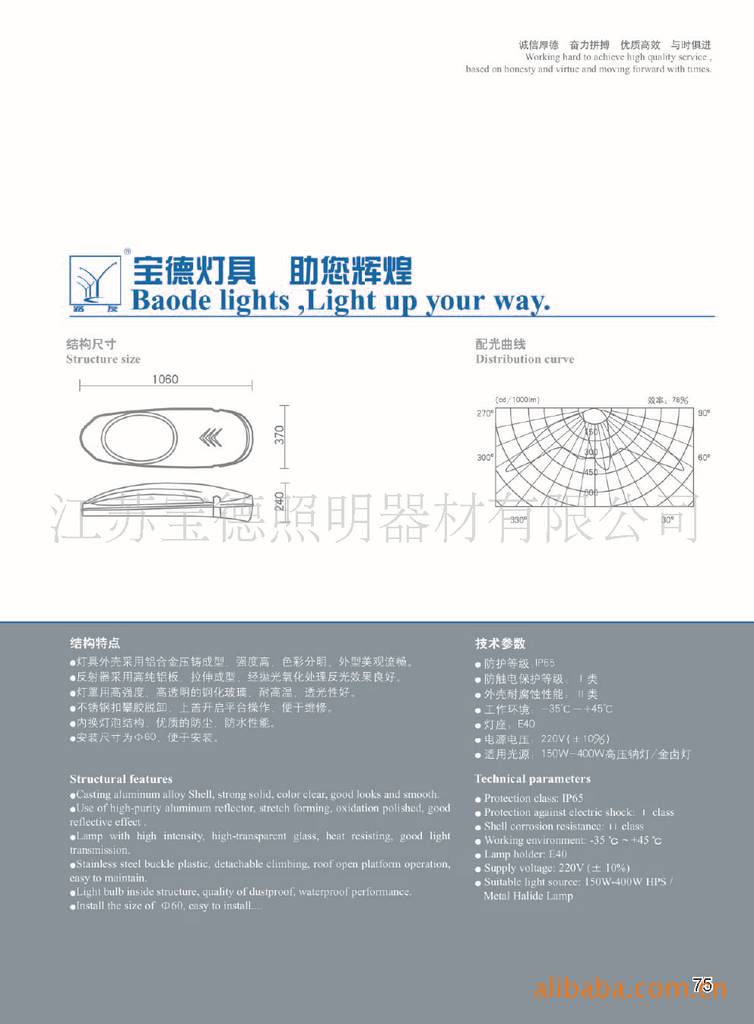 江苏宝德照明器材有限公司(原扬州市宝德照明器材有限公司)位于扬州市北郊送桥工业园区,交通便捷,物流便捷。宝德人大力弘扬“诚信厚德、奋力拼搏、优质高效、与时俱进”的企业精神,经过十多年的发展,目前公司注册资金达到5038万、年销售额过亿元、厂区面积40000平方米的规模企业,拥有高级知识分子,专家技术人员50多人,拥有大中型设备120多套,并与上海亚明、南京三乐、深圳高力特、无锡振发等公司长期合作,专业研发生产各种道路照明器材,太阳能光伏组件及太阳能光电应用产品、LED产品、交通安全设施器材、输变电钢管杆及构支架、通信塔等产品。目前已具有十多项专利技术,我们自主研发生产的骄子系列、报喜鸟系列、东风系列灯具已被灯具行业广泛选用。