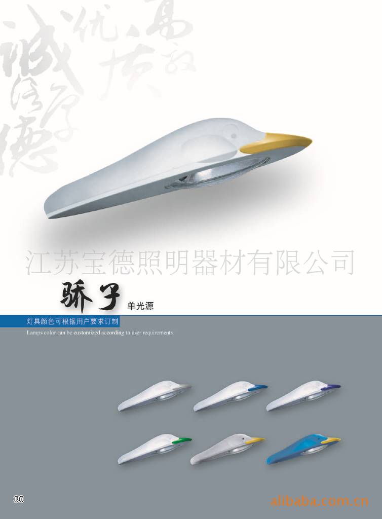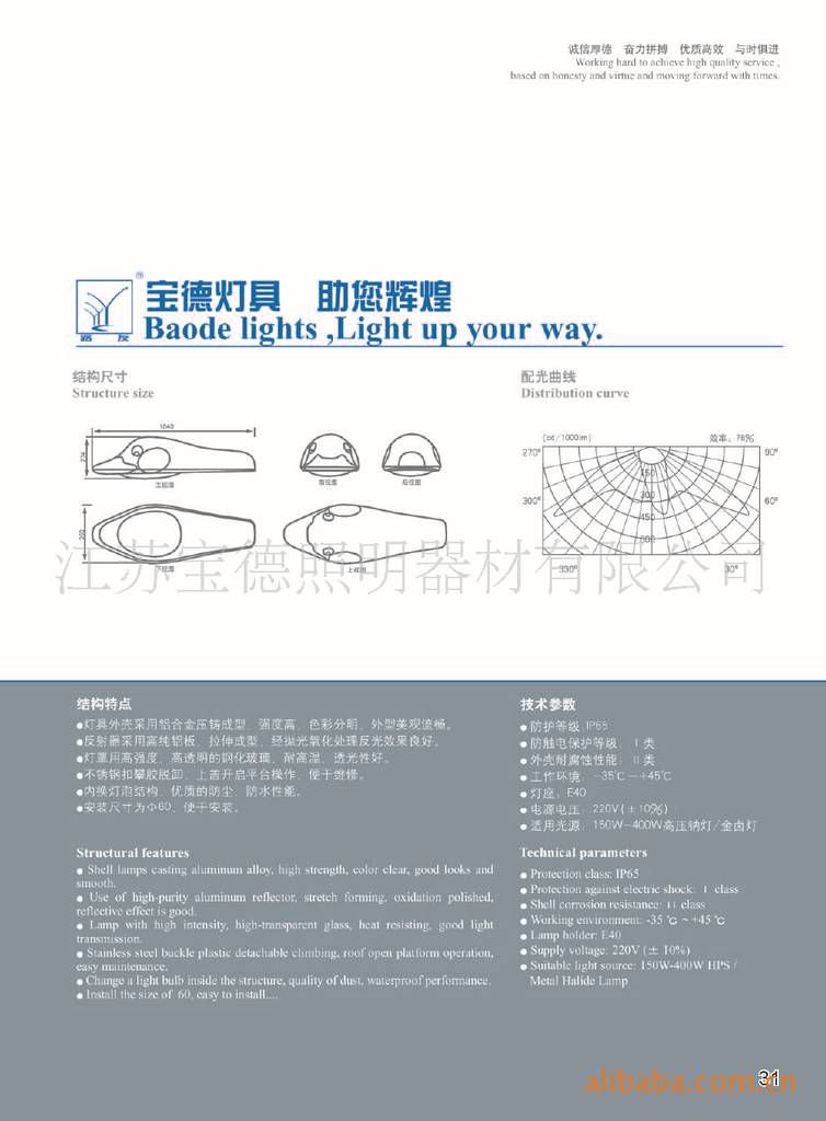 江苏宝德照明器材有限公司(原扬州市宝德照明器材有限公司)位于扬州市北郊送桥工业园区,交通便捷,物流便捷。宝德人大力弘扬“诚信厚德、奋力拼搏、优质高效、与时俱进”的企业精神,经过十多年的发展,目前公司注册资金达到5038万、年销售额过亿元、厂区面积40000平方米的规模企业,拥有高级知识分子,专家技术人员50多人,拥有大中型设备120多套,并与上海亚明、南京三乐、深圳高力特、无锡振发等公司长期合作,专业研发生产各种道路照明器材,太阳能光伏组件及太阳能光电应用产品、LED产品、交通安全设施器材、输变电钢管杆及构支架、通信塔等产品。目前已具有十多项专利技术,我们自主研发生产的骄子系列、报喜鸟系列、东风系列灯具已被灯具行业广泛选用。