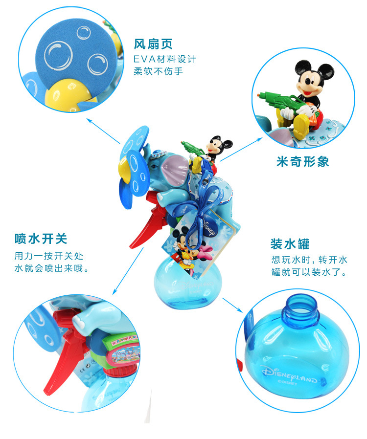 风扇就会自动转动,在风扇转动的同时小孩子还可以用力按喷水开关来玩水哦~