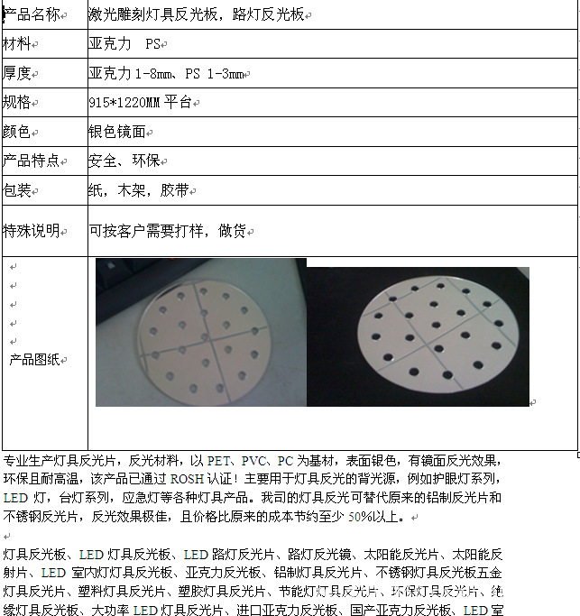 专业生产灯具反光片,反光材料,以PET、PVC、PC为基材,表面银色,有镜面反光效果,环保且耐高温,该产品已通过ROSH认证!主要用于灯具反光的背光源,例如护眼灯系列,LED灯,台灯系列,应急灯等各种灯具产品。我司的灯具反光可替代原来的铝制反光片和不锈钢反光片,反光效果极佳,且价格比原来的成本节约至少50%以上。