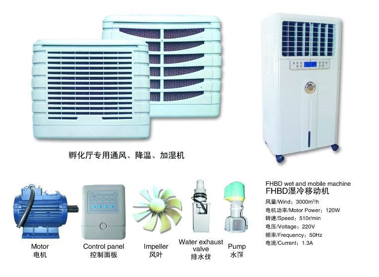 4.电压380V/50Hz,风机功率0.55KW,水泵功率0.35KW,通风量13000³/h,噪音<68dB,耗水量20kg/h-25kg/h,外形尺寸1080*1080,重量50kg,适用面积80-120²,送风距离10m。