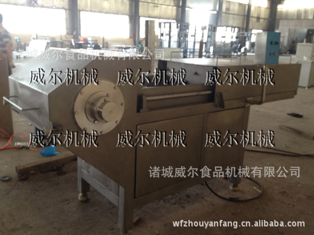 该设备采用液压系统做动力,将原料肉通过推料油缸输送,原料肉滑到切刀的挡块部位,通过切刀滚动使原料肉切成块状肉。切刀速度可通过电机调速进行调节(可选配变频器,电机可进行无极调速)。切刀系统采用皮带轮传动,比一般的齿轮泵传动更具有安全性。推料系统采用液压传动,可单独调节压力和推进速度。物料通过液压油缸进行前后往复运动,同时电机带动刀轴,刀与物料接触并完成切割动作。整机采用304不锈钢,传动系统更具有噪音低,工作平稳,生产效率高等优点。