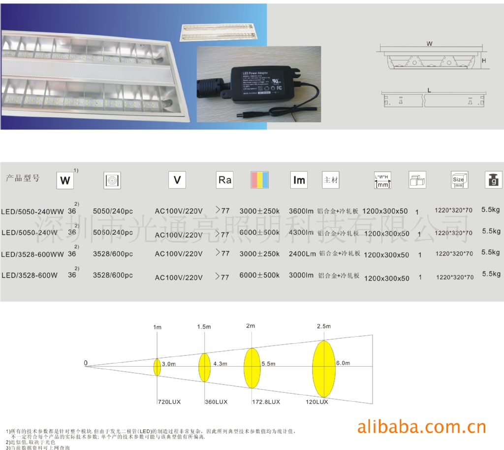 LED模组:光源由4块LED模组组成,每块模组含60颗高亮度的白光LED 5050