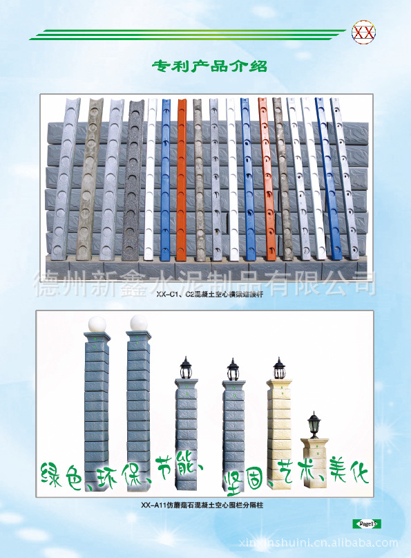 德州新鑫水泥制品有限公司成立于2003年6月,是一家专业研发、生产、销售施工于一体的技术密集性企业。自公司成立以来,以精湛的技术力量为基础,率先研发出具有自主知识产权的艺术水泥栏杆、高速铁路桥梁栏杆、铁路路基防护栅栏、RPC盖板、高强复合沟盖板、电缆槽、无机复合保温板、无机复合地暖铺块、高强水泥隔离墩、防火抗震保温房等系列产品及其配套模具和生产设备,先后获得国家八项专利。并在2005年中国国际专利技术产品交易会上荣获金奖,专利发明人被评为中国百名基层战略创新杰出人物。
