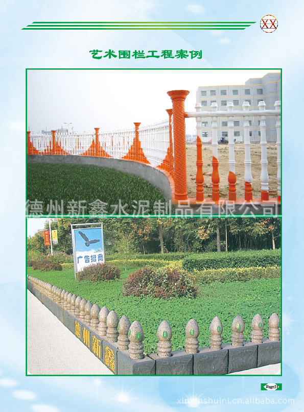 随着社会进步和经济的发展,我国城镇公用设施、住宅小区、工业园区、别墅区、城乡绿化带、学校、河沿、阳台等建筑越来越多,围墙、护栏作为建筑物不可分割的一部分,其材质、造型、质量直接影响到主体建筑风格、城镇景观和对外形象。近年来,各地政府相继出台了拆墙透绿、通风透景等环境改造政策,明令禁止砌筑实心围墙,根据这一市场需要,德州新鑫水泥制品有限公司研发了美观、坚固、实用、价廉的水泥艺术围栏。