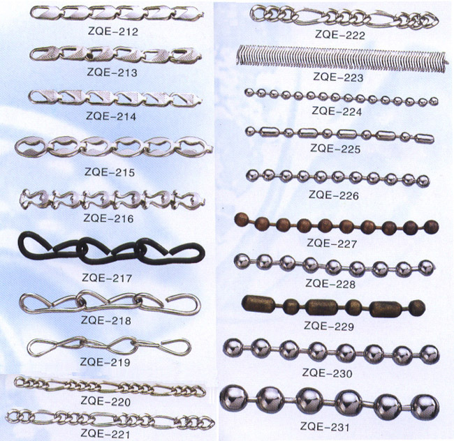 五金配件有铃铛,锌合金吊牌、铜/铁/不锈钢夹子、珠链、各类链条等