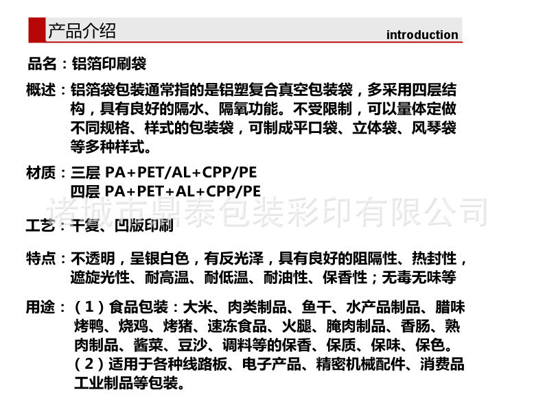 (2)食品包装:大米、肉类制品、鱼干、水产品制品、腊味、烤鸭、烧鸡、烤猪、速冻食品、火腿、腌肉制品、香肠、熟肉制品、酱菜、豆沙、调料等的保香、保质、保味、保色。