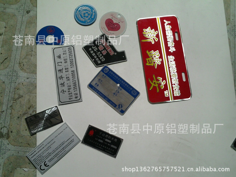 苍南县中原铝塑制品厂是我厂专业生产各类标牌:反光牌、铝牌、金属印刷、铭牌、夜光标牌、铝制标牌、丝印PVC标牌、不干胶标签、不干胶卡通、胸牌、卡通胸牌、标识牌、门牌、车牌、星级牌、电视牌、电价牌、门前五包!专业生产加工的公司,拥有完整、科学的质量管理体系。苍南县中原铝塑制品厂的诚信、实力和产品质量获得业界的认可。欢迎各界朋友莅临参观、指导和业务洽谈。。欢迎各位客户、上门参观!