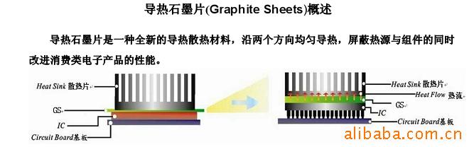 导热石墨片主要特性:高导热系数;石墨导热片能平滑贴附在任何平面和弯曲的表面,并能依客户的需求作任何形式的切割。