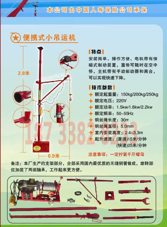 室内吊运机体积小,重量轻,安装方便,操作方便,性能优良,是一种应用极为广泛的小型机械。而且速度快运行稳,操作灵活,减轻了搬运工人的劳动强度,提高了工作效率。便携式吊运机的主要特点是:携带方便(体积小、重量轻、结构紧凑)、安装简捷(5分钟就可安装好);吊的高(120米);速度快(100米往返一次只需6分钟);容易操作。安全可靠(1小时就可以学会操作机器,且有安全限位开关以防万一)。它广泛应用于建筑公司、装潢公司、安装公司、吊运公司、搬家公司,同时也是下岗工人、农民工投资小、见效快的新型致富工具。