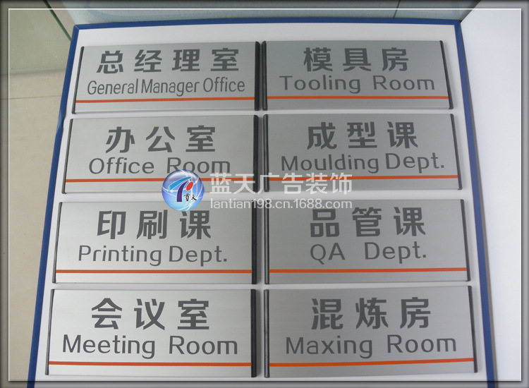 2、铝合金科室牌贴不干胶 这主要是由铝合金所制的科室牌做底加上,通常为银色底加上配搭不同颜色的不干胶字或背胶写真,该科室牌稳重、严肃,与丝印的铝合金科室牌相比成本低出货快,通常只要三两天,数量少当天即可出货。货快,通常只要三两天,数量少一两天即可出货。这种科室牌也有双面和单面之分.