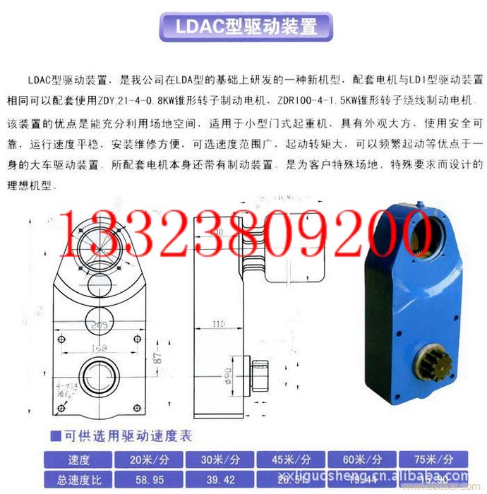 LDAC1型驱动装置属我公司专利产品,是在LDA型的基础上研发的一种新型机,适用于1-5吨门式、半门式起重机。可配套使用ZDY(D)系列0.8KW、1.5KW锥形转子制动电机,或ZDR系列1.5KW、2.1KW锥形绕线转子制动电机和实心转子制动(软起动)电机等。该装置的特点是能够充分利用场地空间,所配套电机本身还带有制动装置,是为客户特殊场地、特殊要求而设计的理想机型。是集起动转矩大,可选速度范围宽,可以频繁起动,运行速度平稳,使用安全可靠,安装维修方便,美观大方等优点集于一身的大车驱动装置。
