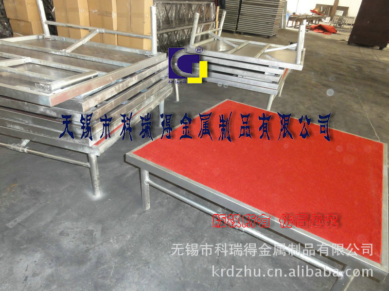 常规舞台尺寸:1.22m*1.22m方形,舞台板采用18mm厚建筑胶合板,两面防水。表面铺5mm厚高档纤维红色地毯,角铁包边。