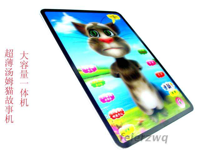 2、故事:开机状态下,按下此键会进入故事乐园,里面有20个经典的故事和你分享的,并可用(上一曲/下一曲)来任意选择故事,还可以用(音量加/音量减)来调节声音大小,故事状态下,不要触摸汤姆猫和其他按键,否则会切换到别的功能的。