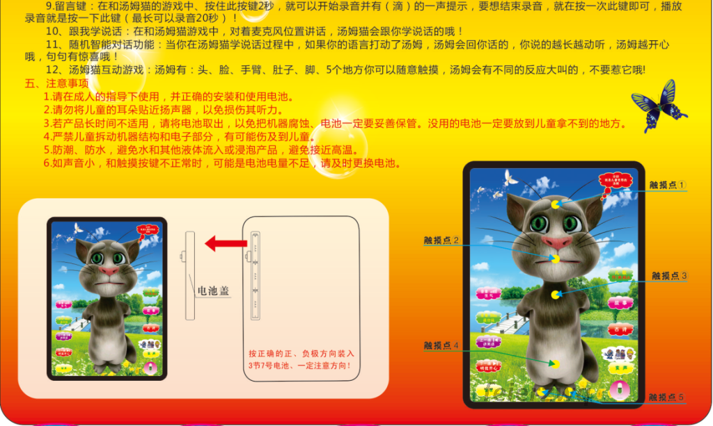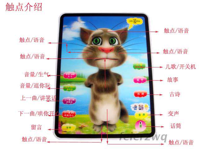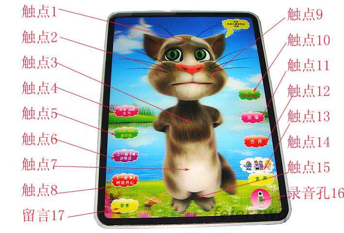 1、汤姆猫:按开机键后,打过招呼之后会自动进入汤姆猫互动游戏模式,猫的整个身体有5个触点,分别为:头、脸、肩膀、肚子、脚。每个触点都会发出不同的搞怪语音,你可以尽情的摸他,小心有时他要收费的哦,哈哈。重复触摸语音会自动切换。