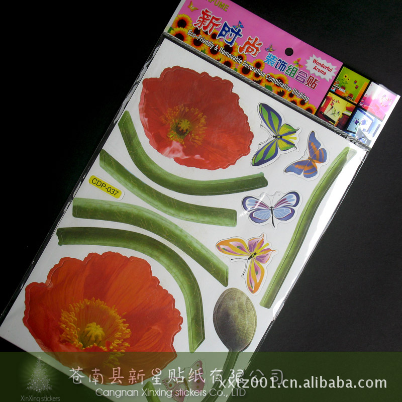 广告语或根据客户提供的要求和描述进行设计和生产,并提供打样服务。现开发的新款清香型组合墙贴采用先进印刷技术,加入淡雅清香与花卉图案相呼应,展