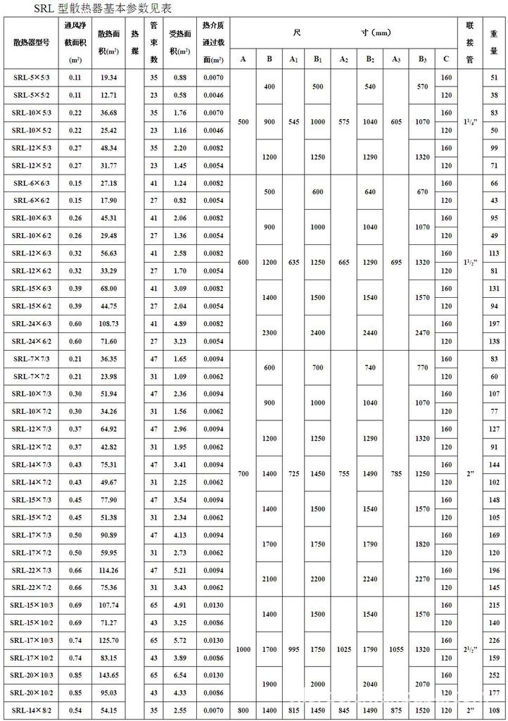 SRL型散热器以蒸汽或过热水为热媒,蒸汽压力最高为8kg/cm2,过热水温度为160℃,适用于空气调节系统及干燥室内的空气加热。