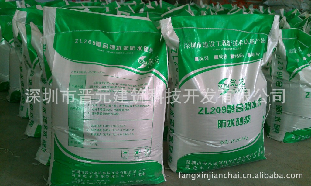 筑龙ZL209 型聚合物干粉防水砂浆是由进口聚合物胶粉、纤维素、聚丙烯酸盐等高分子材料和其它填料复合而成。具有抗裂、抗渗、防水、防潮、防冻、抗冲磨、耐腐蚀等多种功能,能加速水泥颗粒水化和分散,减少用水量,堵塞由于砂浆硬化、水分蒸发后而留下的孔隙,使砂浆不产生干收缩裂缝,降低吸水率,达到防水抗渗,增加抗压强度的目的。