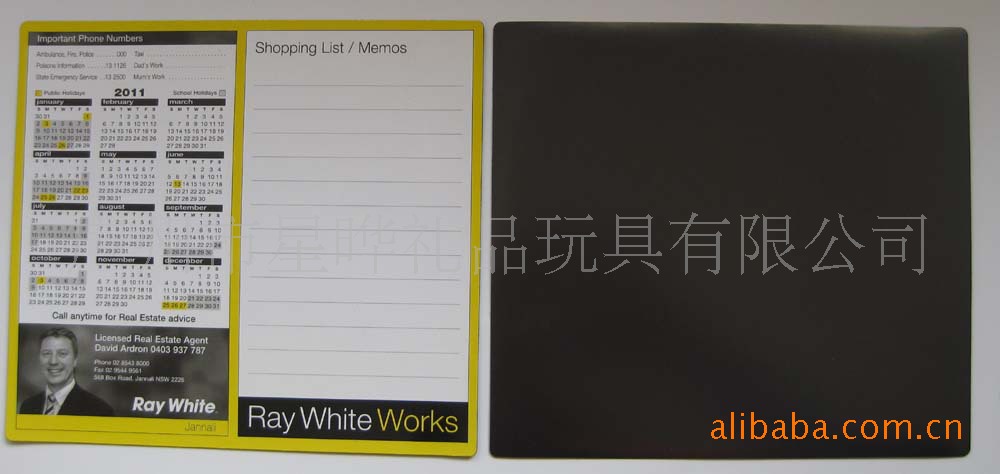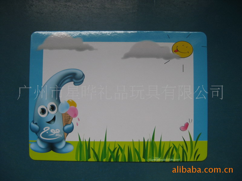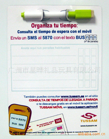 4)磁性留言板 白板:采用软胶磁铁(或纸板)+铜版纸四色印刷裱光膜+可擦笔