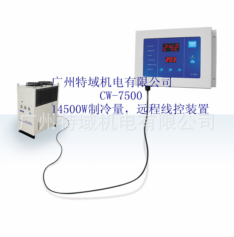 特域CW-7500系列冷水机,五匹机制冷量,可达14500W,可用于冷却大激光器、高速主轴等,机型结构紧凑,体积小巧,方便移动。具备远程线控和恒温、智能温控两种工作模式,采用远达200米的控制温控器,可以远程操作,避免热量干扰;智能温控的模式可随温度的变化而调整至相应的水温,一键解千愁,客户再不用烦恼季节变换水温的调整问题;还有多种设定和故障显示功能,给客户操作带来极大的便利性。产品经过国际质量管理体系ISO9001:2000认证,专业质量保证。