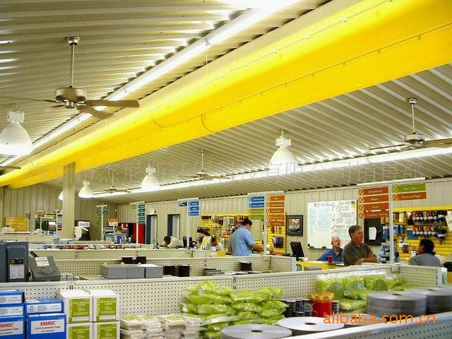 大型商场、超市一般没有天花吊顶。空调系统送风回风管道大多是裸露在空调受控区域内。传统材质风管美观度不高,且承重量大,而杰尼斯空气分布系统布风管系列织品布风管重量可以忽略不计(是传统风管的3%),还可以根据客户需求印制logo、宣传口号等。更为重要的是杰尼斯空气分布系统系列织品输送布风管系统送风方式设计灵活,可在不同区域设计不同出风方式,以满足不同区域对风量冷量不同分布的要求,如:果蔬区域设计微渗透出风方式,可避免果蔬由于出风风速过大而流失水份的问题;在排队收银区域可设计喷孔出风方式或实现该区域大风量大冷量布风的要求。