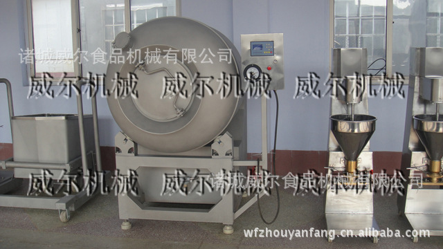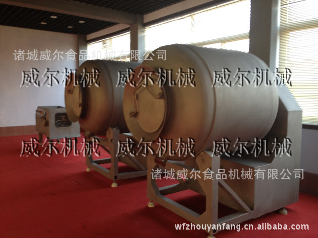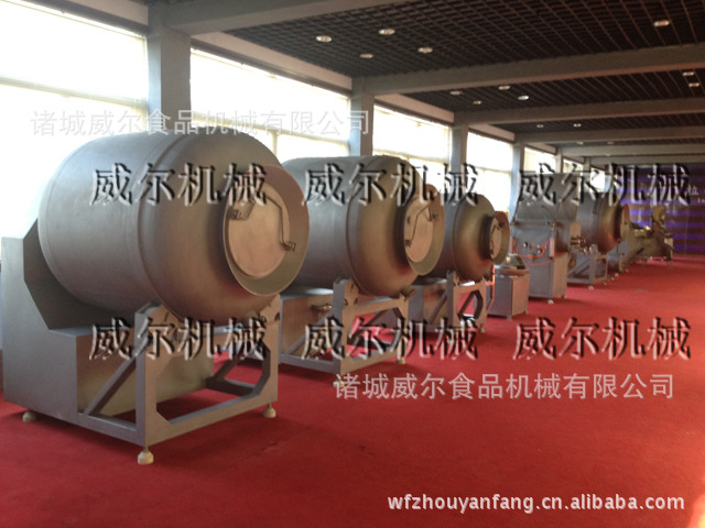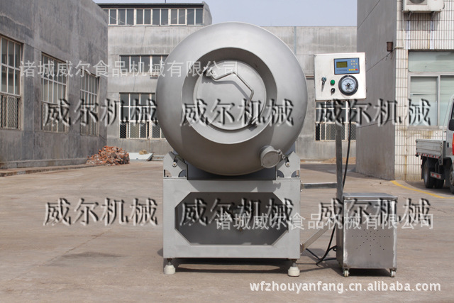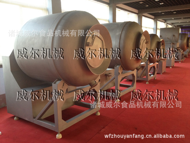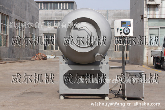 真空滚揉机是在真空状态下,利用物理冲击的原理,让肉在滚筒内上下翻动,相互撞击、摔打,达到按摩、腌渍作用,使肉均匀的吸收腌渍,提高肉的结着力及产品的弹性,通过滚揉、按摩能使肉体蛋白质分解成水溶性蛋白,易被人体吸收,同时能使添加料(淀粉等)与肉体蛋白质互为融合以达到肉质变嫩,口感好,出口率高。本机具有肺呼吸功能,让产品在滚筒内膨胀、缩小了往复运动,改善了肉组织的结构,提高了切面效果。