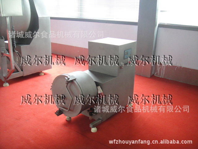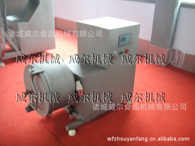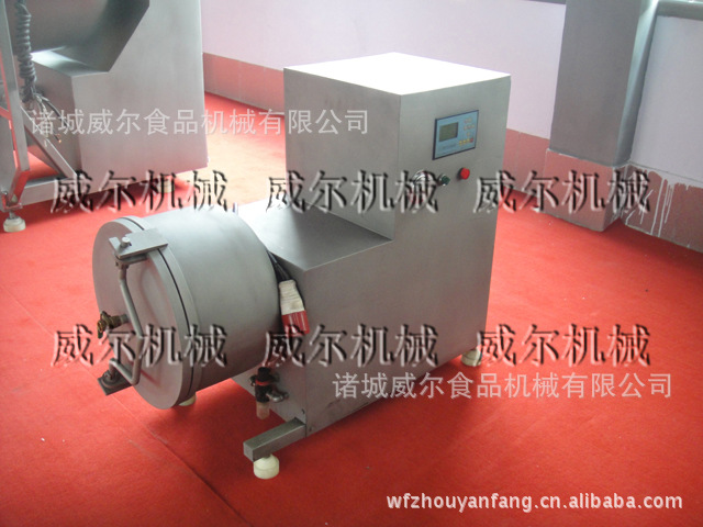 真空滚揉机是在真空状态下,利用物理冲击的原理,让肉在滚筒内上下翻动,相互撞击、摔打,达到按摩、腌渍作用,使肉均匀的吸收腌渍,提高肉的结着力及产品的弹性,通过滚揉、按摩能使肉体蛋白质分解成水溶性蛋白,易被人体吸收,同时能使添加料(淀粉等)与肉体蛋白质互为融合以达到肉质变嫩,口感好,出口率高。本机具有肺呼吸功能,让产品在滚筒内膨胀、缩小了往复运动,改善了肉组织的结构,提高了切面效果。