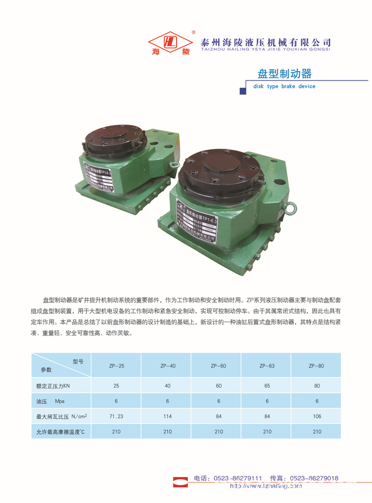 盘形制动器是应用于矿井提升机刹车系统的液压执行机构,准确的名称应为:常闭式后置油缸盘形制动器,目前采用较多的是后置式油缸,在提升机启动时,液压站输出压力油打开制动器,提升机开始工作,工作制动时,液压站根据工况升高或降低压力,制动器就会提供与之相反的制动力,在事故状态下,液压站压力回到残压,制动器以最大制动力在最短时间内让提升机停车.