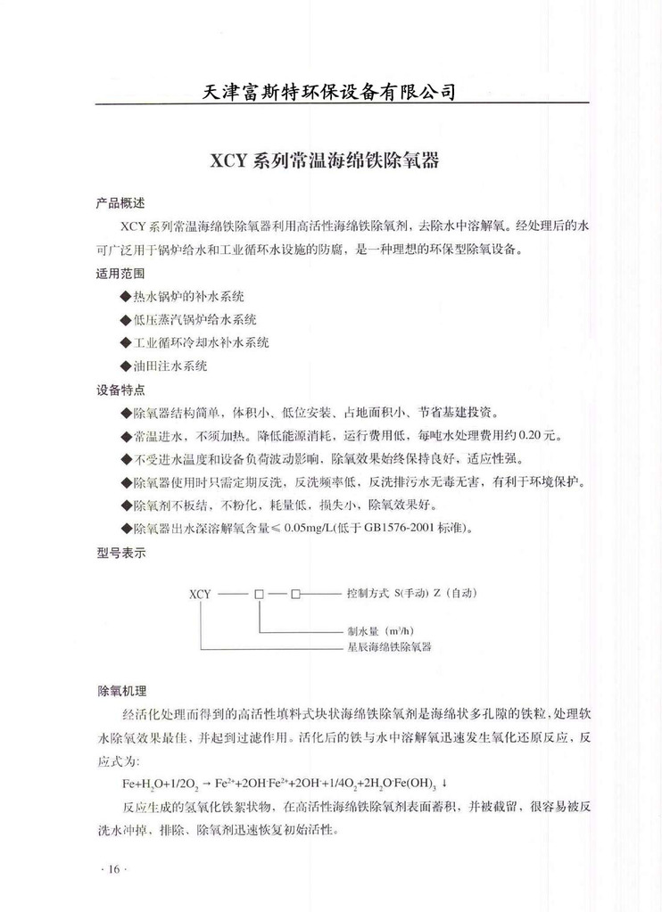 型号释义:如FST-500HCY FST:表示富斯特系列水处理设备;500:表示海绵铁过滤除氧器罐体直径是500mm; HCY:表示海绵铁除氧器。