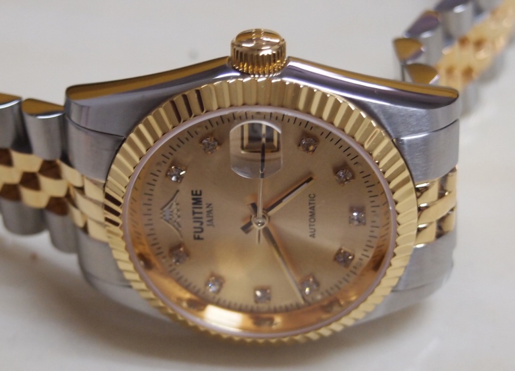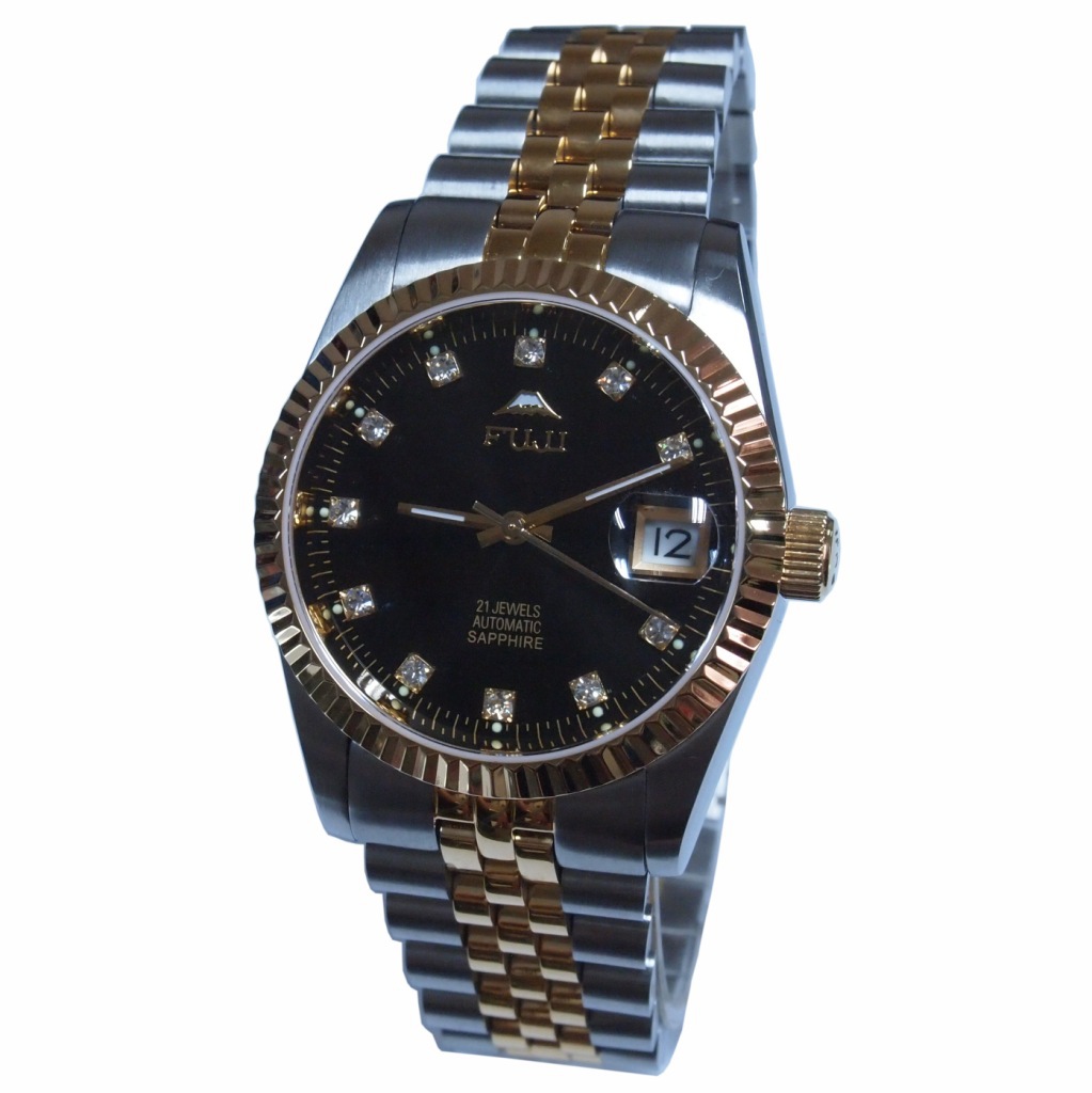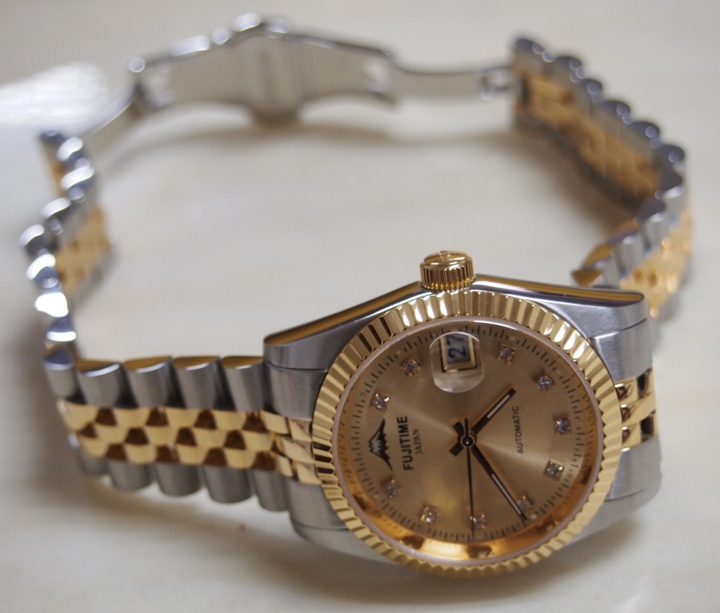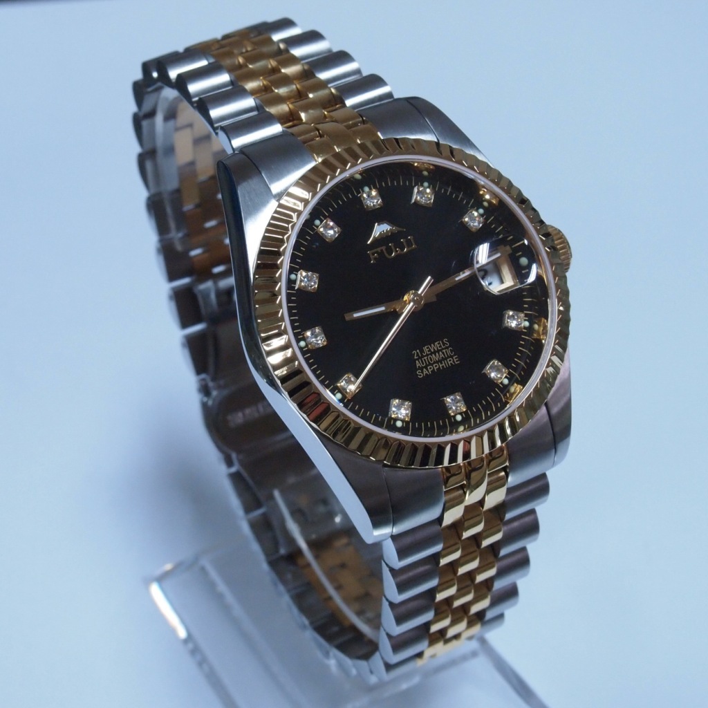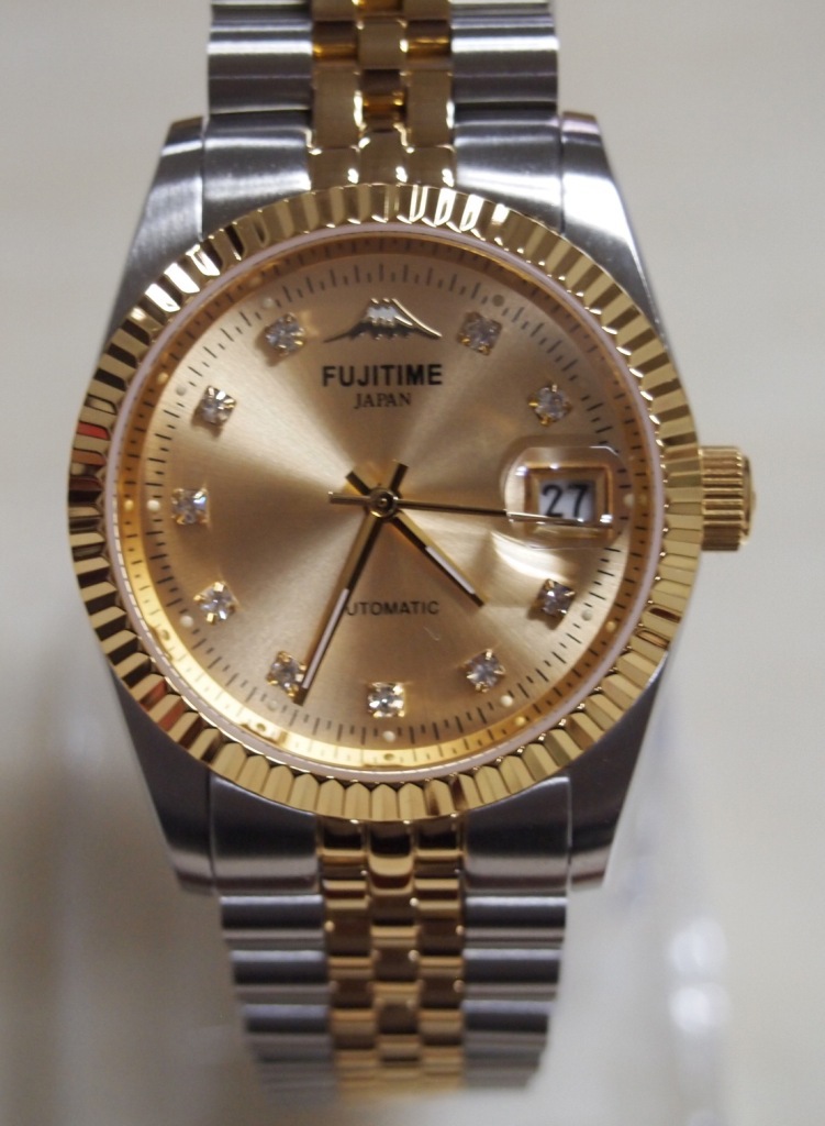 FUJITIME富士手表,男装,日本316L精钢表壳、表圈,全实心不锈钢五珠表带,双按蝴蝶扣,壳、圈、表带真空电镀18K真金,蓝宝石玻璃,镂空透视底,日本原装进口8215单历全自动机械机芯。30米防水(郑重声明:30米防水不是其他商家说的生活防水,而应该是在三十米深的水压下不进水,因为正归的工厂在装配时都会用试水机高压试水,既然标明3ATM,本身就应该达到30米水压的防水要求,试问:谁能游泳至30米水深处?所以,达到30米防水要求的话,在生活当中是不需要取下来的,除了到海里游泳和高温桑拿需取下,一般环境都可以戴在手上,如果商家不敢承诺这点,其产品就带有虚假的成份!敬请留意!