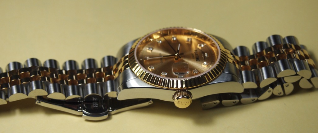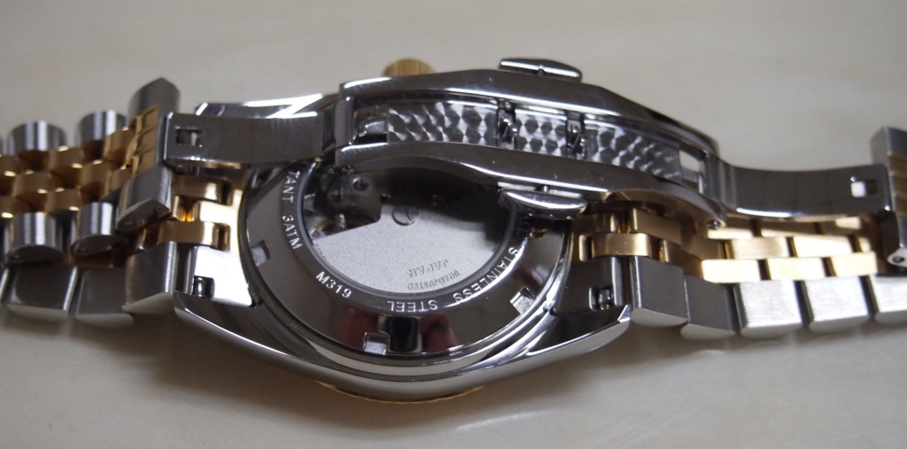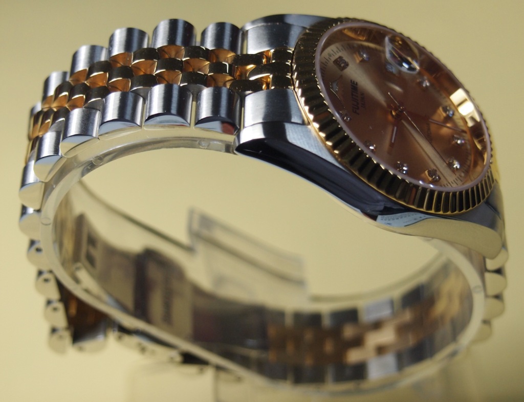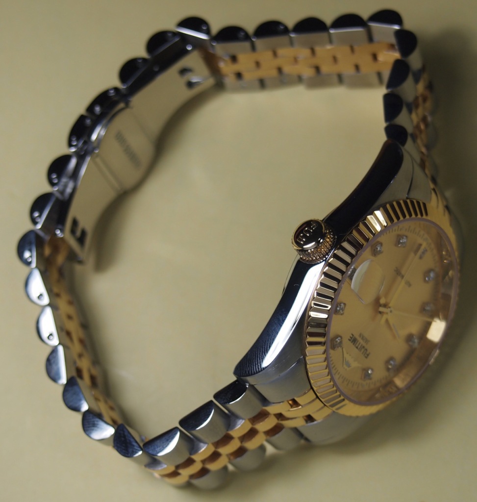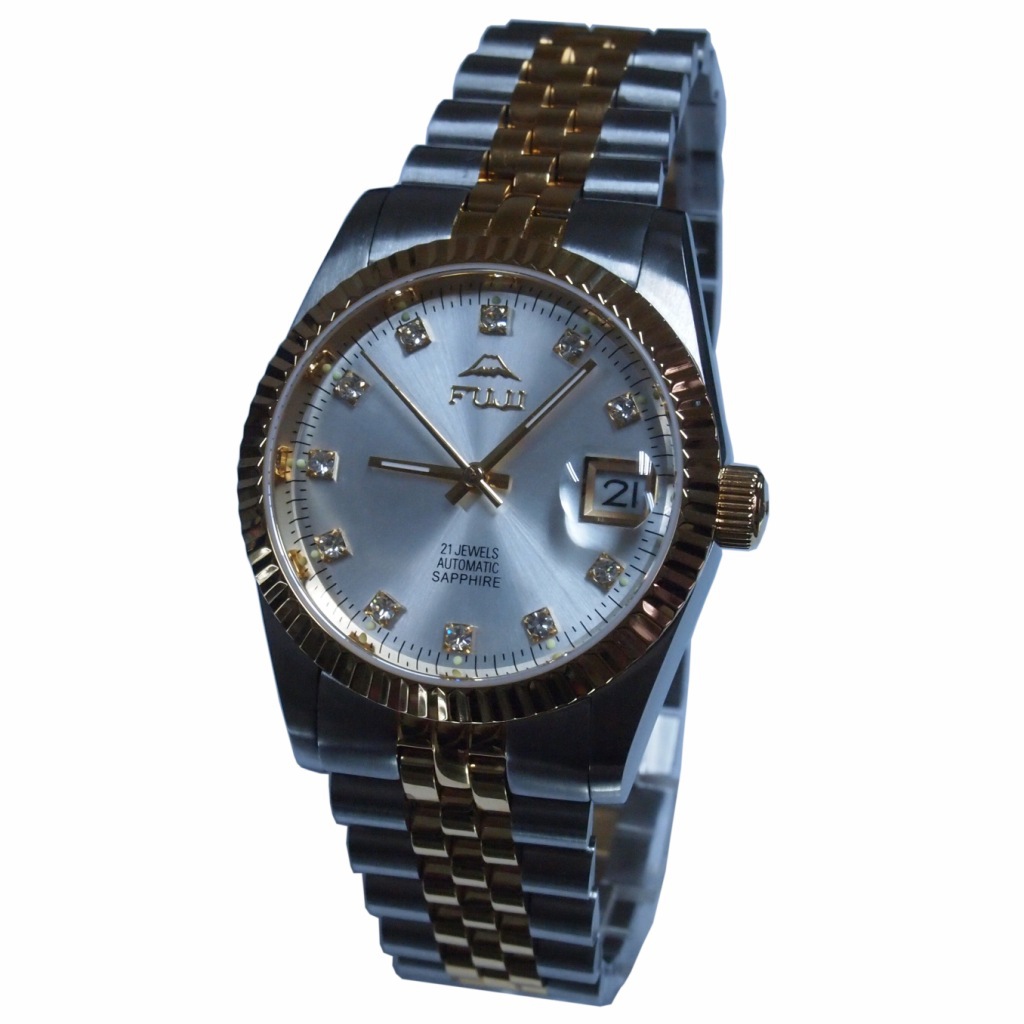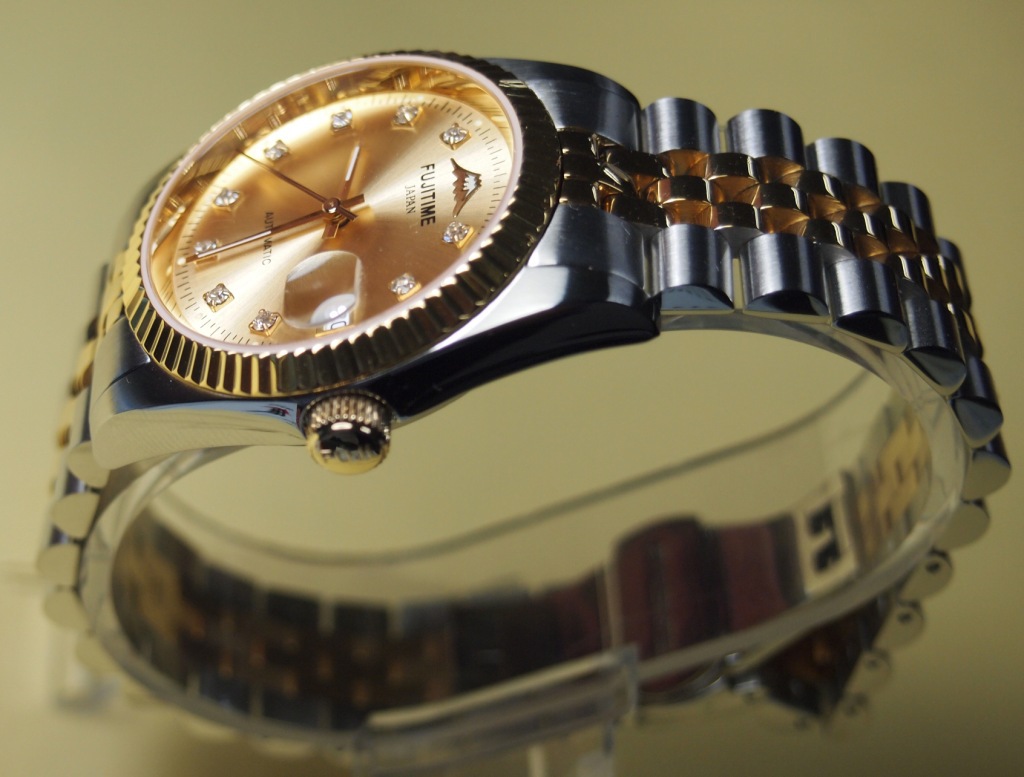 FUJITIME富士手表,男装,日本316L精钢表壳、表圈,全实心不锈钢五珠表带,双按蝴蝶扣,壳、圈、表带真空电镀18K真金,蓝宝石玻璃,镂空透视底,日本原装进口8215单历全自动机械机芯。30米防水(郑重声明:30米防水不是其他商家说的生活防水,而应该是在三十米深的水压下不进水,因为正归的工厂在装配时都会用试水机高压试水,既然标明3ATM,本身就应该达到30米水压的防水要求,试问:谁能游泳至30米水深处?所以,达到30米防水要求的话,在生活当中是不需要取下来的,除了到海里游泳和高温桑拿需取下,一般环境都可以戴在手上,如果商家不敢承诺这点,其产品就带有虚假的成份!敬请留意!