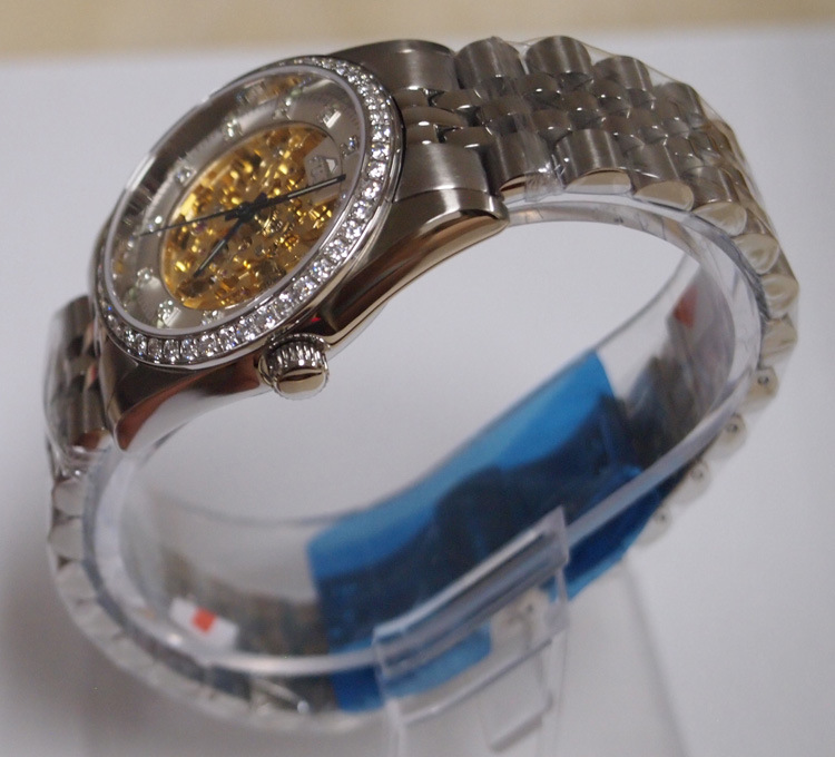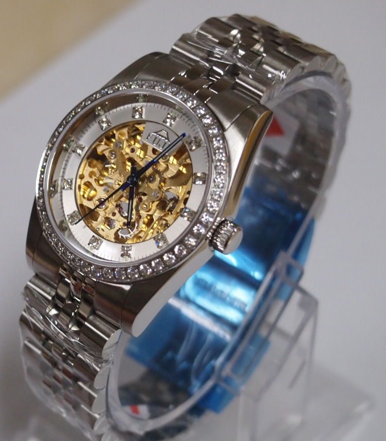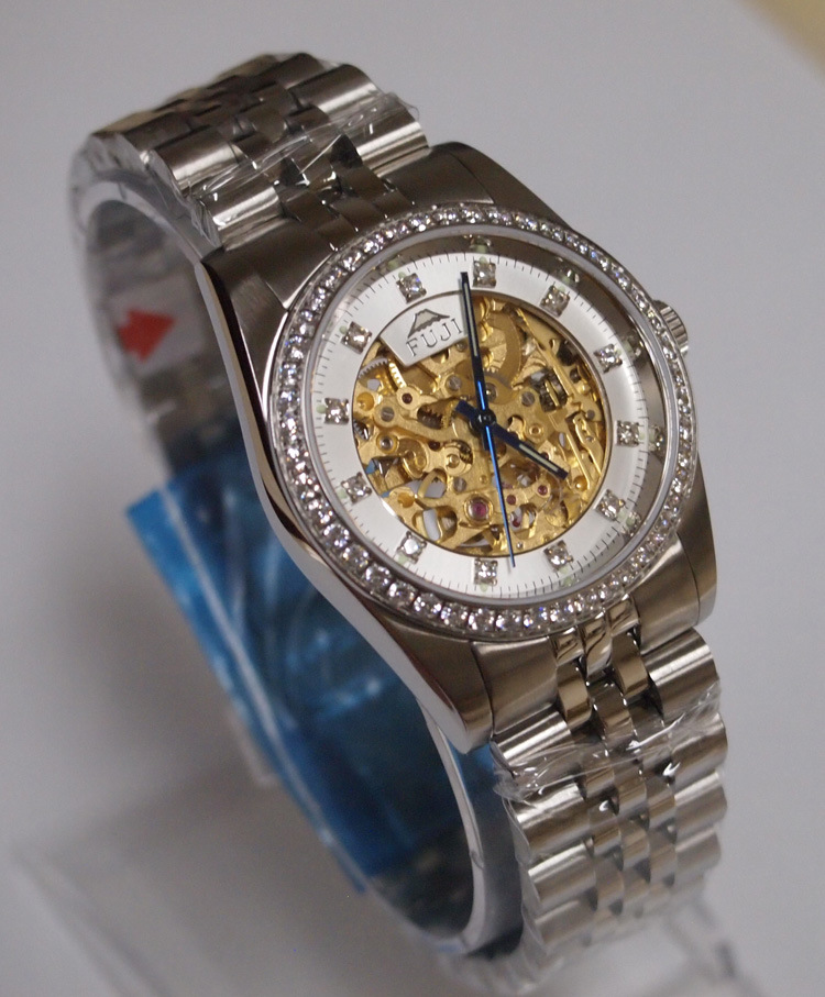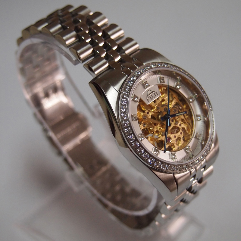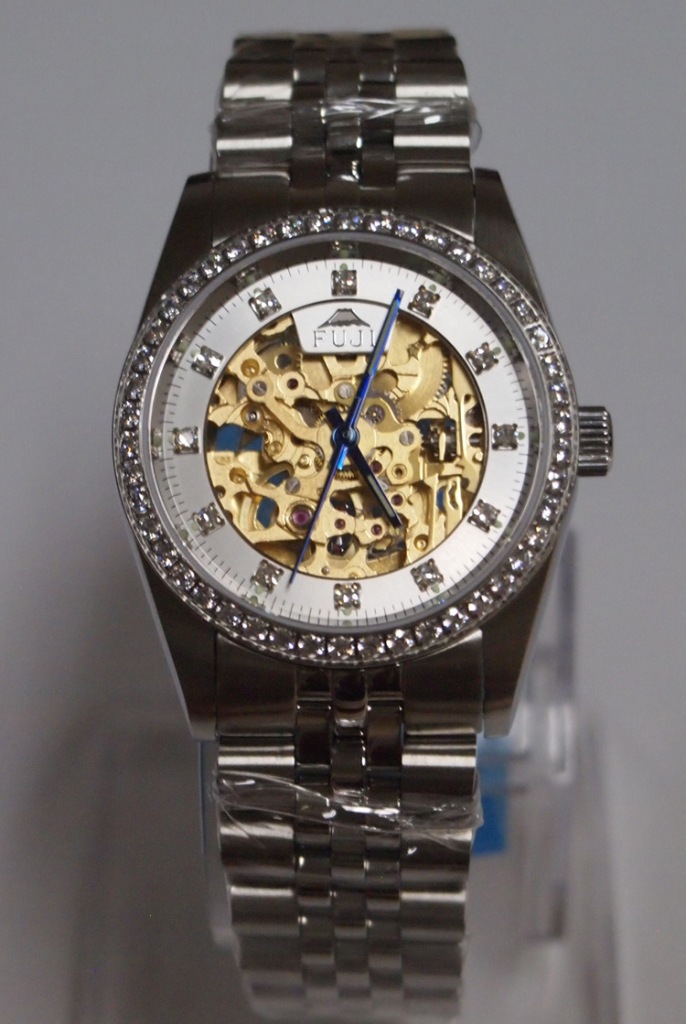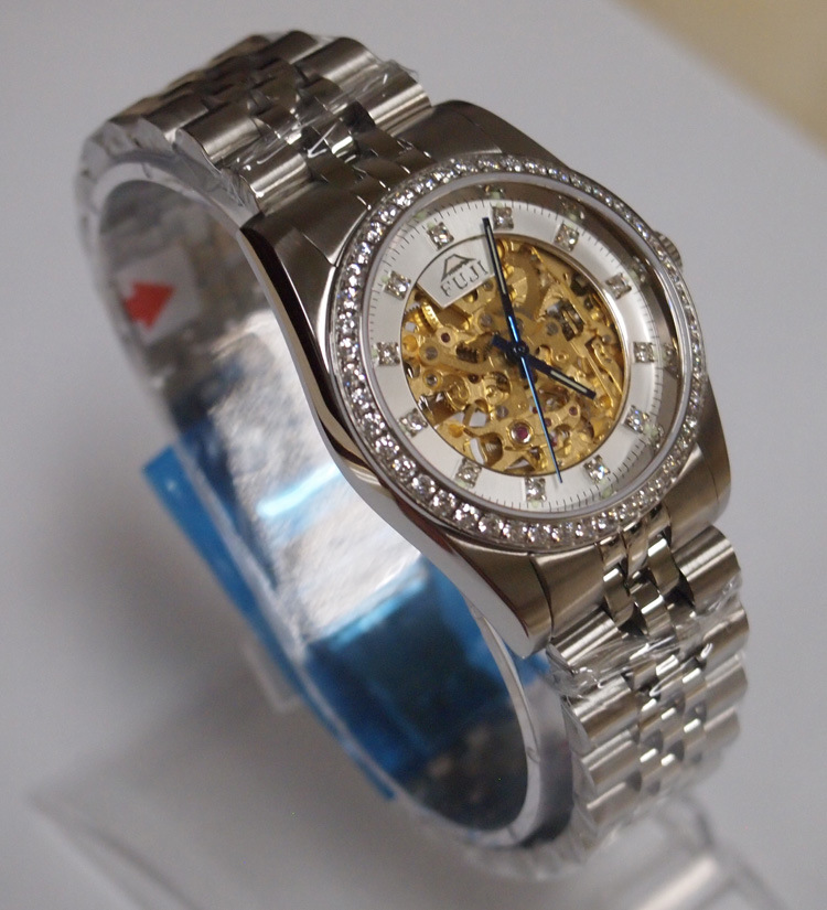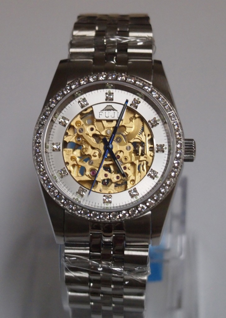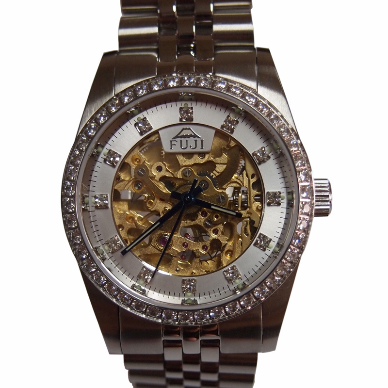 FUJITIME富士手表,男装,316L精钢表壳、表圈、圈面镶46颗进口八心八箭锆石、实心五珠钢带,双按蝴蝶扣,蓝宝石玻璃,镂空透视底,日本原装进口全自动机械镂空金机芯,30米防水。