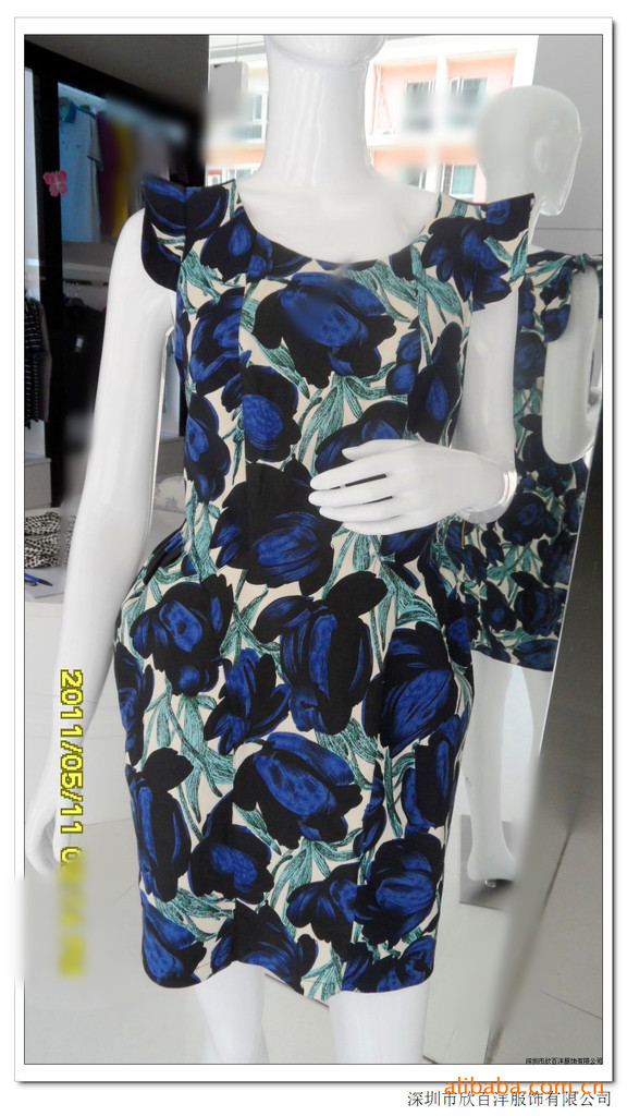 弹力 蓝白色 花苞 花边袖口 无袖 连衣裙 合体 性感花苞款