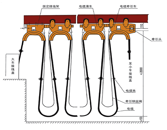 CH型滑车由牵收引滑车、电缆滑车、终端滑车三部分组成,牵引滑车跟随移动机械导缆(牵引)装置,每个移动机械配1个,随移动机械往返运行。中间电缆滑车将电缆悬挂在工字钢轨道范围内随牵引滑车移动,两端并装有缓冲撞头,滑车视移动长度不同而定数量。终端滑车固定在工字钢导轨末端,一般每个移动机械设置1个。