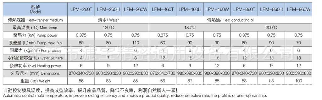 ●采用PID参数自整定温控制器双向(加热/冷却)温度控制,能准确稳定模具所需温度,精确正负1℃;