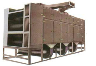 概述 带式干燥机将所要处理的物料通过适当的加料机构,如星型布料器、摆动带、粉碎机或造粒机,分布在输送带上,输送带通过一个或几个加热单元组成的通道,每个加热单元均配有空气加热和循环系统,每一个通道有一个或几个排湿系统,在输送带通过时,热空气从上往下或从下柱上通过输送带上的物料,从而使物料能均匀干燥。