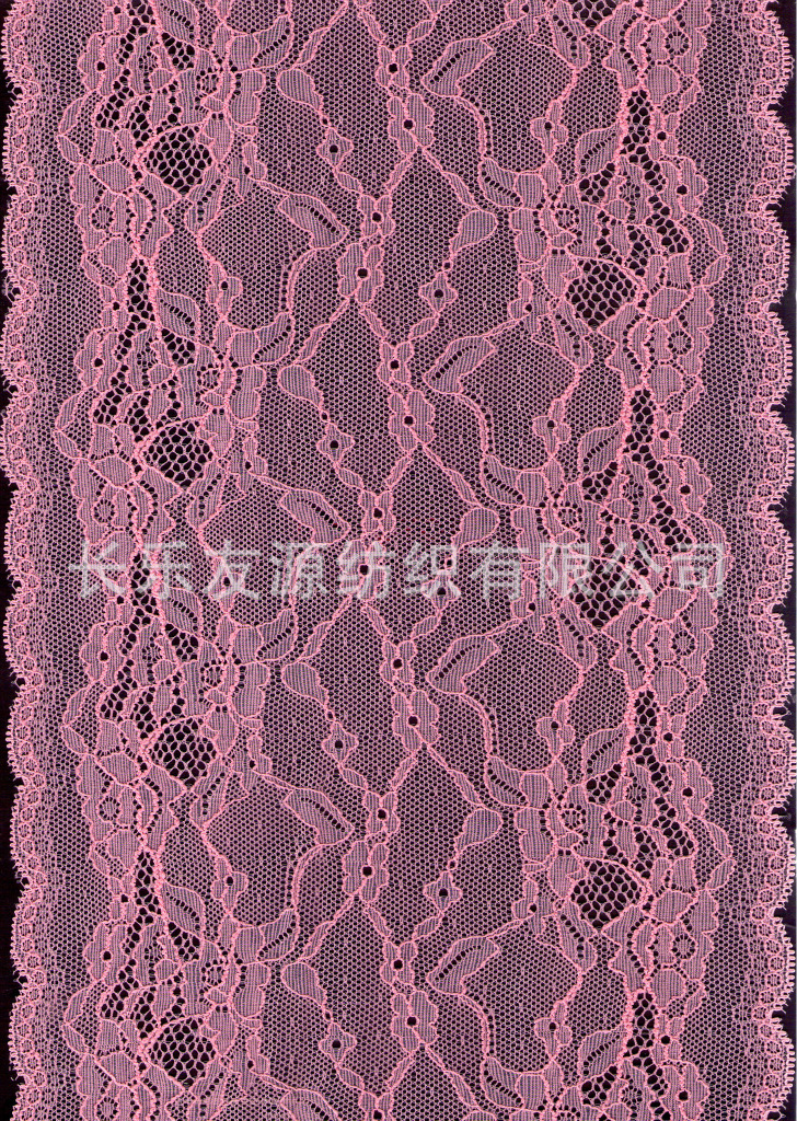 我公司专业生产中高档弹力蕾丝面料、蕾丝花边、网布。蕾丝系列产品多样化,有:弹力蕾丝面料、无弹蕾丝面料、有弹花边、无弹花边、电脑贾卡压纱版、提花花边、金银线花边、双色压纱花边、眼睫毛花边、棉纱蕾丝面料等。产品的风格潮流独特,花型高贵典雅,质量优良稳定,赢得了广大客户的一致好评。其中,压纱、骨线、剪线、金线、银线、双色、睫毛、棉绒产品,花型别致,立体感强,成为女性服装面料辅料的绝佳搭配,也是服装设计的精华所在。欢迎您来函来电订购,真诚与您合作!