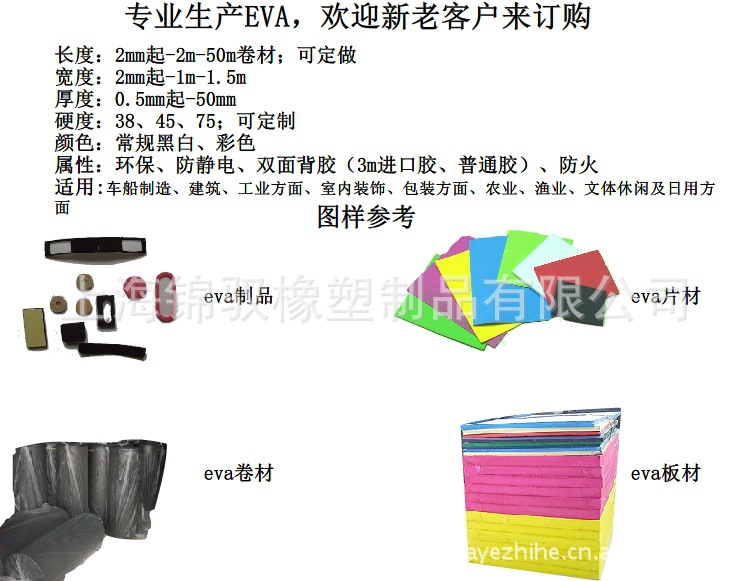 公司主要生产:EVA(片、卷材、垫片、拼图地垫);橡胶硅胶制品(管、套、条、件、圈、垫片、按键、护线套、发泡条、保护套、防尘套);纤维棉(喷胶、吸音、公仔、过滤);海绵制品(耳机棉、高低密度);铜箔铝箔;魔术贴;绝缘材料(快巴、pet)。油压、高周波、喷胶、贴合、冲型于一体多元化一条龙生产厂家。